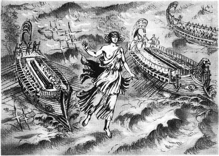 И вдруг в синем чистом небе, над парусами, эллины увидели призрак женщины. Ее тело было прозрачным, точно паутина, но голос ее звучал над морем, подобно раскатам грома: "Вперед, мои отважные дети! Не отступайте ни на шаг! Вперед, только вперед!"