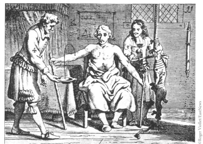 Дени де Монпелье. Первое переливание крови от животного к человеку 15 июня 1667 года. Гравюра. Понимание циркуляции крови порождало мысль о возможности ее переливания — в большинстве случаев из–за отсутствия знаний о группах крови эксперимент оканчивался трагически.