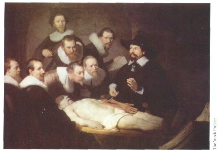 Рембрандт. Урок анатомии доктора Тульпа. 1492. Гаага, Королевская галерея Маурицхёйс. В «Уроке анатомии доктора Тульпа» Рембрандт представляет «бесстрастную» точку зрения: группа медиков, не выказывая эмоций, наблюдает за демонстрацией, проводимой одним их видных членов корпорации. В более позднем «Уроке анатомии доктора Деймана» акцент смещен: в центре внимания — безобразный человеческий труп.