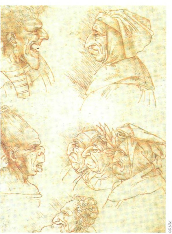 Приписывается Леонардо да Винчи. Семь гротескных голов. Венеция, Академическая галерея. Как и Дюрер, Леонардо охотно создает вариации на тему телесного уродства. «Гротескные головы» Леонардо неотделимы от «совершенных» профилей юношей и молодых мужчин, которые он зарисовывает на протяжении всей жизни.