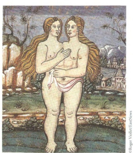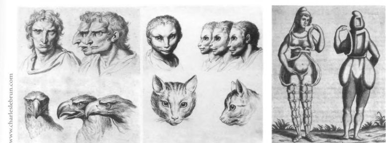Слева: Шарль Лебрен. «Физиогномические головы». Анималистический символизм Лебрена служил для передачи эмоций и физиогномических толкований, но в то же время и ставил вопрос о телесных пропорциях. Справа: Неизвестный автор. Гравюра, изображающая гермафродита. Ок. 1690. Гермафродитизм — часто встречающаяся в литературе Нового времени телесная девиация. Некоторые медицинские трактаты рассматривали гермафродитов как существ «третьего пола».