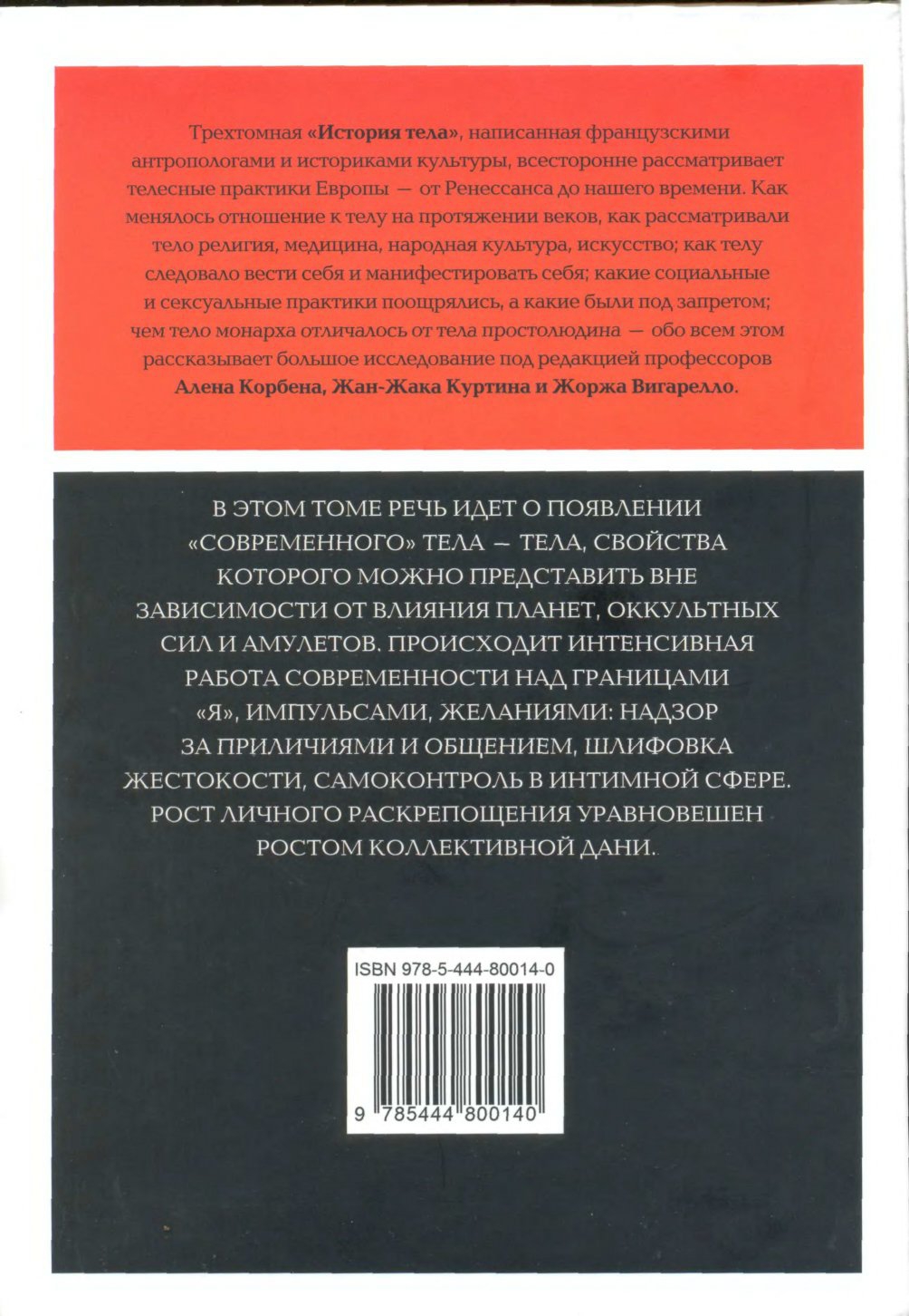 Трехтомная «История тела», написанная французскими, британскими и американскими антропологами и историками культуры, всесторонне рассматривает телесные практики Европы — от Ренессанса до нашего времени. Как менялось отношение к телу на протяжении веков, как рассматривали тело религия, медицина, народная культура, искусство; как телу следовало вести себя и манифестировать себя; какие социальные и сексуальные практики поощрялись, а какие были под запретом; чем тело монарха отличалось от тела простолюдина — обо всем этом рассказывает большое исследование под редакцией Алена Корбена, Жан–Жака Куртина и Жоржа Вигарелло. Первый том посвящен истории тела от Ренессанса до эпохи Просвещения и описывает становление европейского образа «современного» тела. История тела здесь рассматривается в разных аспектах: тело и религия, тело и общество, тело и сексуальность, тело и медицина, тело и игра, тело и власть.