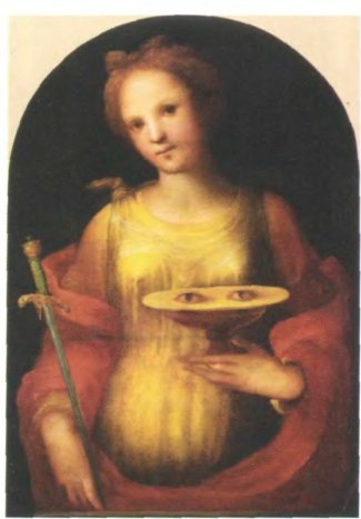 Доменико Беккафуми. Святая Луция. 1521. Сиена, Национальная пинакотека. Истязаемая изуверами часть тела — знак, который позволяет узнать святого среди ему подобных, идентичность, которую святой охотно демонстрирует. В случае святой Луции это глаза.