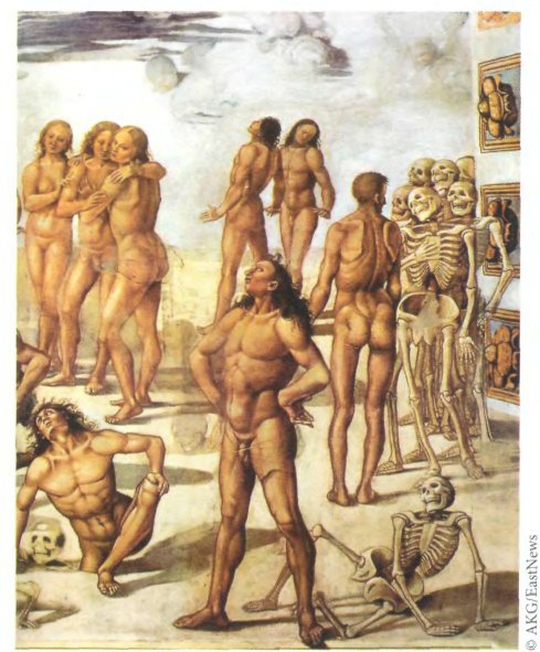 Лука Синьорелли. Воскрешение во плоти (фрагмент). 1499–1502. Орвието, часовня Сан–Бризио. Скелеты вылезают из земли, обрастают плотью, обретают форму. Мужчины и женщины воссоединились со своими гармоничными телами и с благодарностью смотрят на Бога. Оригинальность и сила образа свидетельствуют о зрелости художника — и о художественном и культурном повороте на Западе. Религиозная тема служит здесь предлогом для изображения освобожденного тела.