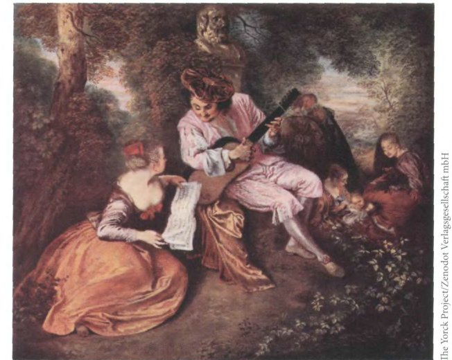 Антуан Ватто. Любовная гамма. Ок. 1717. Лондон, Национальная галерея. «Любовная гамма» — пример изображения «галантной любви» в живописи: ухаживания здесь эстетизированы, а любовники вдвоем заняты гармоничным искусством.