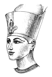 Когда фараоном стал Аменхотеп IV, он повелел поклоняться богу солнечного диска Атону вместо прежнего Амона и перенес столицу из Фив в новый город, построенный на восточном берегу Нила, – Ахетатон. Там были возведены великолепные дворцы для царской семьи и величественный храм Атону. Главным жрецом стал сам фараон. Он переменил даже свое имя, которое означало «Амон доволен», на Эхнатон – «угодный Атону». До нашего времени сохранился скульптурный портрет его супруги Нефертити работы скульптора Тутмеса. Ее имя означало «прекраснейшая явилась к нам». И действительно, достаточно посмотреть на ее изображение: высокая изящная шея, на которой подобно цветку покоится голова, увенчанная высокой короной, лицо с миндалевидными глазами под высокими дугами бровей, плотно сомкнутые, слегка улыбающиеся губы. Недаром ее изображение считается символом совершенства.