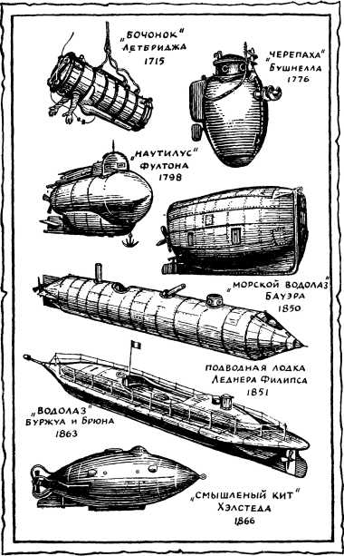 Первая настоящая подводная лодка была построена — увы! — не для идиллических занятий, о которых мечтал когда-то добрый епископ Уилкин. Мрачные нужды войны вызвали к жизни «Черепаху», сконструированную в 1776 году американцем Дэвидом Бушнеллом, чтобы топить английские военные корабли в период англо-американской войны за независимость.