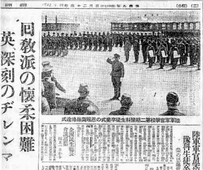 Рис. 54. Фотография из японской газеты военного времени — 24 марта 1942 г. проводилась выпускная церемония для курсантов подготовительного отделения Военной академии сухопутных войск. Честь своим преподавателям на фотографии отдает признанный лучшим «курсант года» — молодой Пак Чонхи (1917–1979), в то время более известный под своим японским именем Такаки Macao. Родившись в бедной крестьянской семье в уезде Сонсан провинции Северная Кёнсан, окончив в 1937 г. педучилище в г. Тэгу и проработав три года учителем начальной школы, молодой честолюбец Пак Чонхи, зачитывавшийся жизнеописаниями Наполеона и «Моей борьбой» Гитлера, решил сделать себе карьеру в японской армии. Интересно. что по окончании основного курса Военной академии в 1944 г., старший лейтенант Такаки Macao был направлен служить в Маньчжурию, в воинскую часть, готовившуюся к боям против Советской армии. Став в результате военного путча 16 мая 1961 г. правителем Южной Кореи, Пак Чонхи (к тому времени командир дивизии в южнокорейской армии), по свидетельствам своих приближенных, до самой смерти сохранил пристрастие к японской военной форме, маршам и самурайским фильмам. Использовавшиеся им методы авторитарного руководства экономикой и обществом были также в значительной мере заимствованы из практики «тотальной мобилизации» Японии времен второй мировой войны.