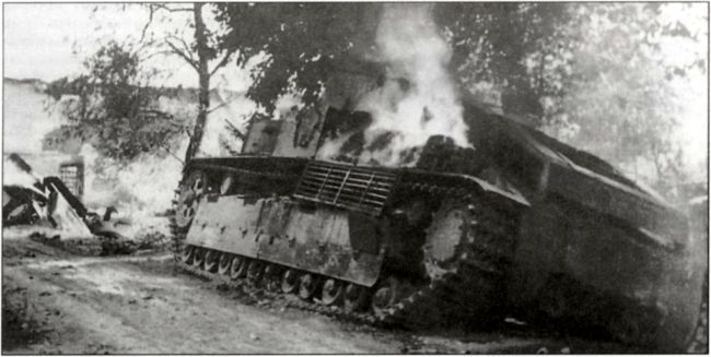 Дымящийся Т-28 на обочине дороги. Большое количество этих танков вышло из строя по техническим причинам и было уничтожено собственными экипажами.