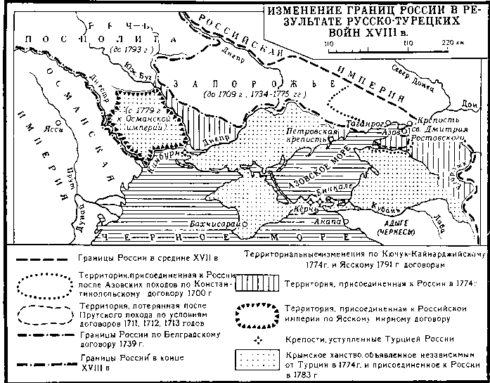 Победоносные русско-турецкие войны второй половины XVIII в. завершили совместную многовековую героическую борьбу братских русского и украинского народов против агрессии со стороны султанской Турции и Крымского ханства. Освобождение Северного Причерноморья и Приазовья от турецкого и татарского владычества и включение Крыма в состав России навсегда положили конец агрессивным устремлениям правителей Османской империи. Используя как послушное орудие зависимых татарских феодалов, турецкая правящая верхушка во главе с султаном многократно делала попытки добиться своих захватнических целей. На украинские и русские земли предпринимались военные походы и совершались частые разрушительные набеги. Захватчики несли смерть и разорение мирному населению, подрывали производительные силы Украины и южных областей России, тормозя тем самым социально-экономическое и культурное развитие огромного и богатого природными ресурсами края. Поэтому освобождение Северного Причерноморья и Приазовья от турецкого и татарского господства, а также включение Крыма в состав России явилось выдающимся историческим событием в жизни украинского и русского народов, которое оказало огромное влияние на дальнейшее развитие всей страны.