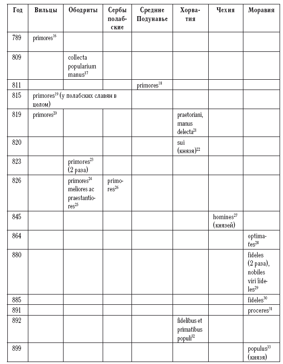 Может сложиться впечатление, что в Хорватии и Моравии – более развитых регионах, где в IX в. уже сложились государства – господствующим слоем в глазах западноевропейских соседей являлась военнослужилая знать (здесь явно к ней относятся 9 упоминаний из 12), а у отстававших в своем развитии полабских славян ситуация была иной (здесь 9 упоминаний из 10 приходятся на термины «неопределенного» характера)[692]. Но надо иметь в виду, что такое распределение терминов во многом может быть связано с Источниковой спецификой. Для «Анналов королевства франков», содержащих сведения о знати полабских славян конца VIII– начала IX в., вообще не свойственно употребление термина fideles, определенно указывающего на служилую знать.