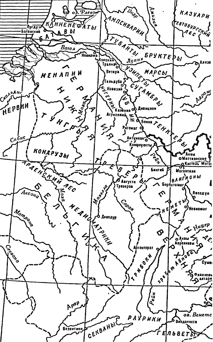 Двумя главными квартирами рейнской армии искони были Ветера на Везеле и Могонтиак, нынешний Майнц, причем обе они возникли еще до разделения командования и послужили одной из причин этого разделения. Каждая из двух армий насчитывала в I в. н. э. по 4 легиона, т. е. около 30 тыс. человек23, и основная масса римских войск была расположена в обоих этих пунктах и на пространстве между ними; кроме того, один легион стоял у Новиомага (Нимвеген), другой — в Аргенторате (Страсбург), третий — у Виндониссы (Виндиш, близ Цюриха), недалеко от ретийской границы. К нижней армии был причислен немалый по своему составу рейнский флот. Граница между верхней и нижней армиями лежит между Андернахом и Ремаге-ном у Броля24, так что Кобленц и Бинген входили в состав верхнего военного округа, а Бонн и Кёльн — в состав нижнего. На левом берегу Рейна к верхнегерманскому административному округу принадлежали территории гельветов (Швейцария), секванов (Безансон), лин-гонов (Лангр), рауриков (Базель), трибоков (Эльзас), неметов (Шпейер) и вангионов (Вормс); к менее обширному нижнегерманскому округу принадлежали территории убиев или, вернее, колония Агриппина (Кёльн), тунгров (Тонгерн), менапиев (Брабант) и батавов, между тем как расположенные далее на запад округа, включая Мец и Трир, были подчинены различным наместникам трех Галлий. В то время как это разделение имело только административное значение, изменение размеров территории обоих правобережных округов было связано с изменением отношений к соседям и с вызванным им расширением или сокращением границ римского владычества. Отношения с этими соседями на Нижнем и Верхнем Рейне были урегулированы столь различным образом, а события там и тут развивались в столь различных направлениях, что провинциальное деление получило здесь величайшее историческое значение. Рассмотрим прежде всего, как складывались отношения на Нижнем Рейне.