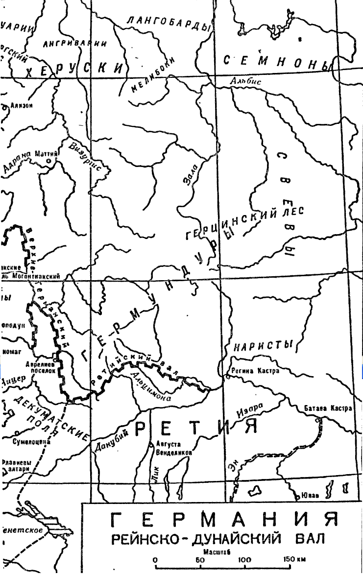 Иное положение сложилось у германцев верхней провинции. Об исторических судьбах живших в этой провинции по левому берегу Рейна германцев — трйбоков, неметов, вангионов — можно сказать лишь то, что они, прожив долгое время среди кельтов, разделяли участь Галлии. Главной римской оборонительной линией здесь также всегда оставался Рейн. Все постоянные лагеря легионов во все времена находились на левом берегу Рейна; даже лагерь у Аргентората не был перенесен на правый берег и тогда, когда вся область Неккара сделалась римской. Но если в нижней провинции владычество Рима на правом берегу Рейна с течением времени слабеет, то здесь, наоборот, оно усиливается. Вероятно, командование этого военного округа никогда не оставляло надежду осуществить задуманное Августом соединение рейнских лагерей с дунайскими посредством продвижения имперской границы в восточном направлении, в результате чего были бы расширены пределы не столько Нижней Германии, сколько главным образом Верхней. Впоследствии снова вернулись к этому проекту, хотя и в более скромном объеме. Состояние наших источников не позволяет нам дать связное описание операций, выполнявшихся в соответствии с этим проектом в течение нескольких столетий, — постройки дорог, валов, а также происходивших в связи с этим войн; сохранившиеся здесь до наших дней мощные укрепления, возводившиеся на протяжении нескольких столетий и воплощающие, несомненно, значительную часть этой истории, до сих пор не изучены детально компетентным в военных вопросах исследователем, как это можно было бы ожидать, и надежда на то, что ученый мир объединенной Германии соединится и для изучения этого древнейшего исторического памятника Германии, не оправдалась. Здесь мы попытаемся дать общую картину, которую удается пока восстановить на основании фрагментов римских летописей и развалин римских укреплений.