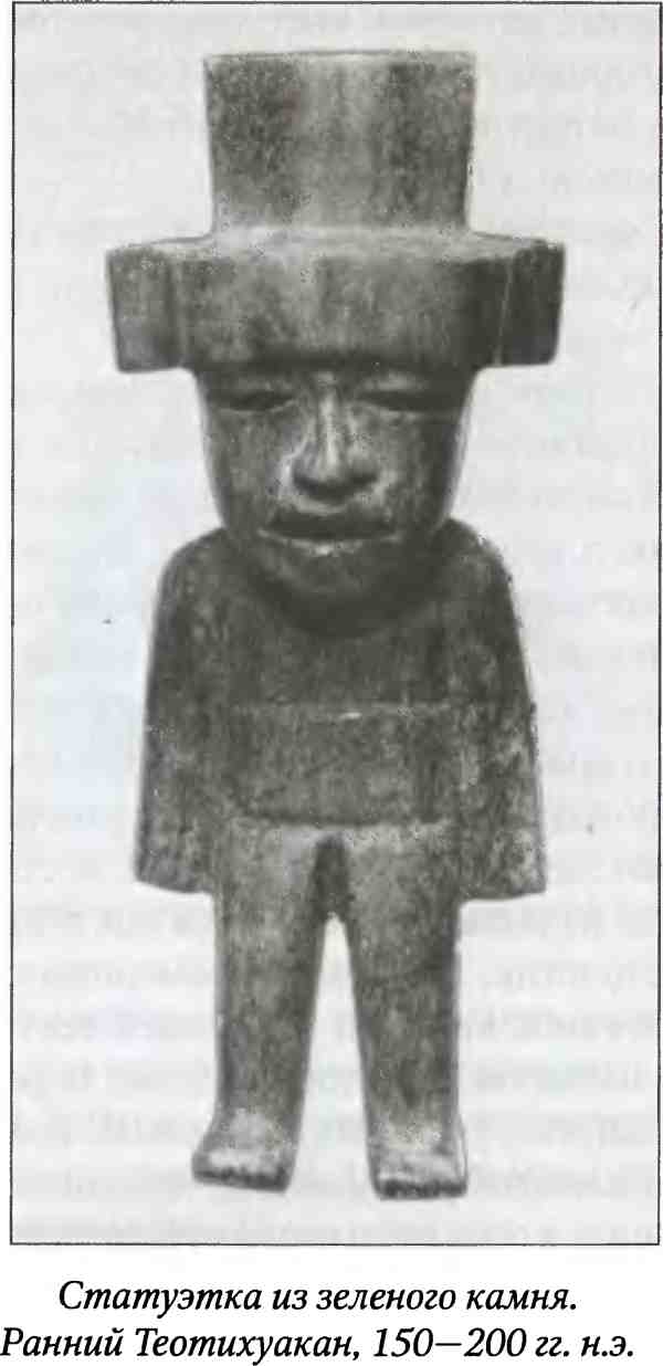 На мой взгляд, ключ к решению этой проблемы дают находки в Каминальуйю, важнейшем центре культуры горных майя (находится на окраине столицы современной Гватемалы). В результате раскопок удалось выявить присутствие в местной культуре сильных теотихуаканских элементов. Речь идет не об отдельных чертах или предметах, а о целом комплексе черт и массе привозных вещей. В III–VI веках н. э. в Каминальуйю возводятся монументальные храмовые постройки из адобов в чисто теотихуаканском стиле и получают широкое распространение центральномексиканские мотивы искусства, религиозные верования, керамика, статуэтки. Степень влияния Теотихуакана на этот майяский город, удаленный от него на сотни километров, столь велика, что вряд ли можно говорить только о торговых или культурных контактах двух центров. Видимо, здесь имело место вторжение теотихуаканцев и установление их господства над местным майяским населением.