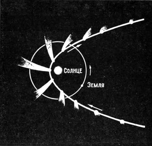 К сожалению, для хвостов первого типа такое объяснение не годится: ведь в них отталкивательные силы иногда в десятки раз превышают силу притяжения Солнца. Наибольшая же возможная величина светового давления способна превышать последнюю только в 2,8 раза. Очевидно, помимо светового давления, в этих хвостах действуют еще какие-то неизвестные нам пока силы.