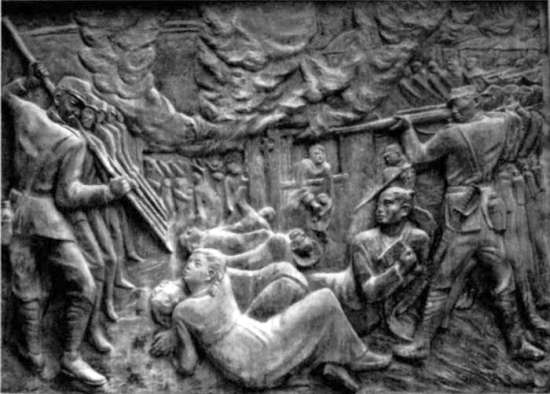 Рис. 39. Расправа в дер. Чеамни, где 15 апреля 1919 г. японские каратели согнали в церковь и сожгли заживо всех ее жителей-христиан. Памятный барельеф в парке «Пагода», Сеул.