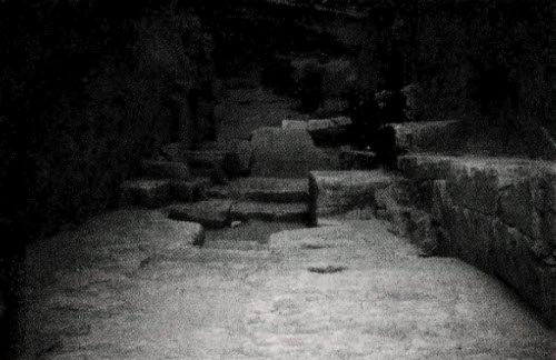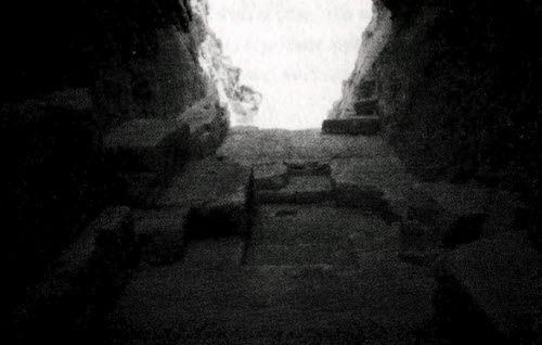 Результаты наших наблюдений показывают, что небольшой холм был «выбурен», чтобы устроить внутри него Пер-Нетер. Мы установили, что камни фундамента по-прежнему «врезаны» в подстилающую горную известняковую породу холма, и пришли к выводу, что пирамида совсем не была оставлена недостроенной; в свое время это была полноценная Пер-Нетер, если судить по камням, которые все еще стоят на своих местах (см. рис. 58). К своему нынешнему плачевному состоянию пирамида пришла либо в результате того, что ее разобрали на отдельные блоки, либо же ее сознательно разрушили. Нам удалось спуститься внутрь холма на глубину примерно в 100 футов, и я с интересом обнаружил там гладкие стены каверны, которые живо напомнили мне стены туннелей, в которые я спускался в Гизе и наблюдал в Саккаре (см. рис. 59). Мне представляется очевидным, что те же самые люди, которые пробурили туннели в Гизе и Саккаре, «вынули» внутренности холма и построили Пер-Не-тер в Абу-Роаше (см. рис. 60).