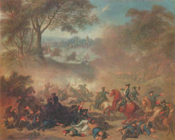 Ж. Наттье. «Битва при Лесной» Сражение у деревни Лесной продолжалось в течение всего дня – с 8 и до 19–20 часов. Русские смогли нанести столь неожиданный удар, что противник понес немалые потери, прежде чем сумел восстановить боевой порядок. Некоторое время спустя Петр I стал выстраивать гвардейскую бригаду вдоль опушки леса, в то время как его основные силы оставались непосредственно в лесу. Левенгаупт решил не допустить их выхода оттуда, для чего бросил в атаку четыре батальона с 10 пушками и четырьмя конными полками. В результате этого наступления шведам удалось подавить Ингерма нландский и Невский полки, захватить четыре пушки, но развить успех дальше им оказалось не по силам, т. к. в бой со стороны русских вступили Преображенский и Семеновский полки. Понесшие потери передние русские шеренги тем временем отводились на задний план, а при необходимости и в лес. Когда наступление шведов ослабло, царь снова приказал построить боевую линию для атаки. В ответ Левенгаупт выкатил тяжелые орудия, и русские вновь отступили. Вслед за этим на некоторое время наступило затишье; бой возобновился с новой силой лишь после полудня. Русская пехота в две линии вместе с кавалерией вышла из леса и стала огнем теснить противника к его укреплениям – поставленным впритык повозкам. К трем часам дня шведы, потерявшие 8 пушек, оказались прижатыми к своим повозкам, но тут Петр I получил известие, что на подходе подкрепление, и дал команду прекратить огонь.