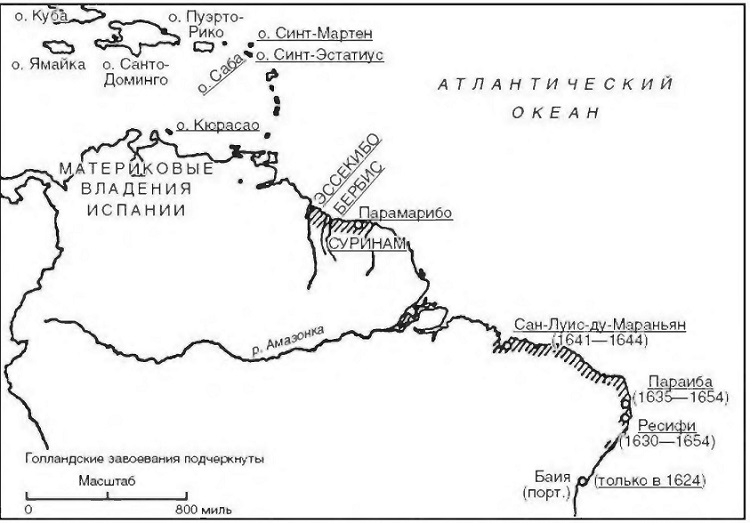 Карта 4. Голландские завоевания в Западных Индиях и Бразилии.
