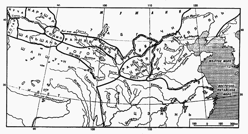 В благодатных оазисах у подножия Наньшаня еще с ханьского времени поселились китайцы. Сначала это были переселенцы из Шэньси, бывшие подданные царства Цинь (IV–III века до н.э.), т.е. самые отважные и неукротимые воины Китая. Дети и внуки переселенцев в условиях пограничной беспокойной жизни еще более отшлифовали военные навыки предков и не утратили их доблести. Хуннские завоевания отрезали их страну от метрополии, но хунны не пытались захватить крепости Западного Ганьсу. Впрочем, и наньшаньские китайцы не стремились стать жертвами хуннских стрел и формально согласились считать себя подданными сначала Хань (с 313 г.), а затем Младшей Чжао.