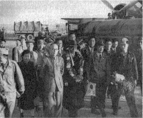 Рис. 34. Возвращение председателя Шанхайского временного правительства Ким Гу и главнокомандующего Армии Освобождения Ли Чхончхона на родину. Перед вылетом в Шанхайском аэропорту. 23 ноября 1945 г.