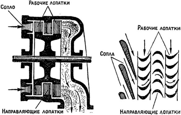 В результате оказывается, что пар может передать колесу со многими рядами лопаток ту же энергию, что и колесу с одним рядом лопаток, но при меньшей скорости вращения колеса, — ведь пар как бы распределил свою энергию одновременно на несколько колес, сидящих на одной оси.