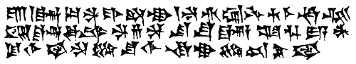 Здесь мы приводим образец новоэламского письма, скопированного с Бехистунской скалы. Это одна из приписок, которыми сопровождаются изображения отдельных фигур на рельефе, в данном случае — фигура низвергнутого Гауматы.