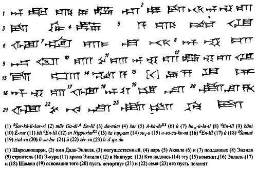 Рис. 82. Передача староаккадской надписи царя Шаркалишарри новоассирийским письмом.