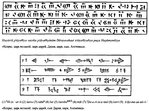 В сущности, древнеперсидское письмо является, так сказать, «поздним вырождением», сокращенной системой подлинной клинописи, системой, приспособленной для практического использования в условиях иранских языков. Древнеперсидское письмо не имеет почти ничего общего с подлинной клинописью (конечно, за исключением клина). Почти ничего, ибо полностью оно от своих предков не отреклось, да и вспомогательные приемы для написания гласных выдают его происхождение от слогового письма.
