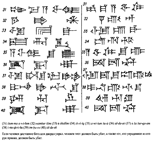 Рис. 86. Старовавилонское письмо (§ 6 Законов Хаммурапи) с передачей новоассирийским письмом.