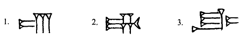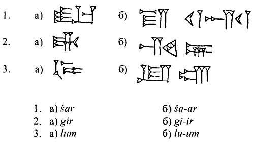 Рис. 90. Полифонические слоговые знаки. 1 — kid, sah, lil. 2 — pi?, gir. 3 — lal, lib, lub, pah, nar.