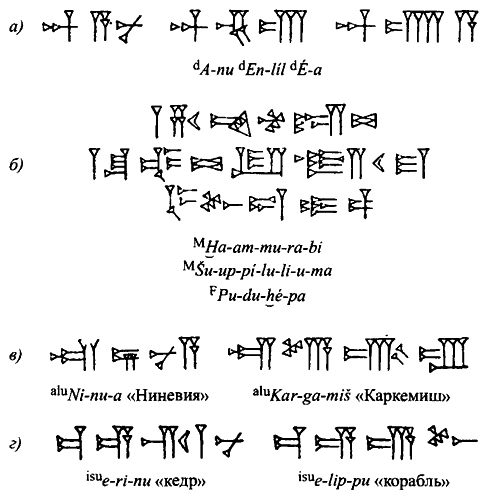 Рис. 96. Аккадские имена и слова с детеминативами: а) имена трех богов с детерминативами: б) два мужских имени и одно женское детерминативами (Хаммурапи, Суппилулиума, Пудухепа); в) два названия городов с детерминативами; г) название дерева и деревянного предмета.