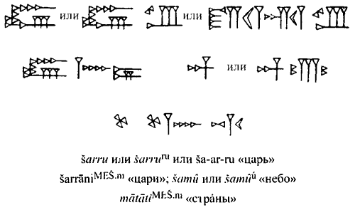 Местные и временные различия выступают и внутри самой аккадской клинописи. Более древние системы (древне- и средневавилонская, древне- и среднеассирийская) сложнее нововавилонской и новоассирийской письменности. Мы не имеем возможности вникать в эти тонкости, да они едва ли и различимы для глаза неспециалиста. Вместо этого не мешало бы попытаться рассмотреть в заключение нашей главы внутреннее строение аккадской клинописи.