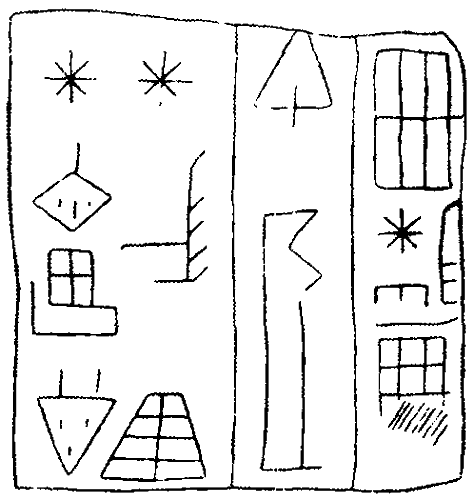 В наиболее древнюю эпоху, когда «писали» мало и это немногое высекалось преимущественно на камне, появились лишь простые линии-штрихи. В форме таких «штриховых надписей» и дошли до нас древнейшие поддающиеся датировке шумерские «тексты». В виде примера мы приводим здесь, на рис. 46, оттиск печати на кирпиче.