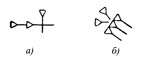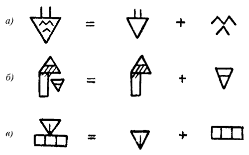 Эти столь простые рисуночные знаки шумеры очень рано начали соединять в различных комбинациях, и прежде всего в тех случаях, когда хотели передать уже не конкретные предметы, а новые абстрактные понятия. Так, из соединения знаков «бык» и «горная страна» возник рисуночный знак «дикий бык» (рис. 100а), из знаков «рот» и «хлеб» — «есть» (рис. 100б), из знаков «женщина» и «платье» — «госпожа» (рис. 100в).