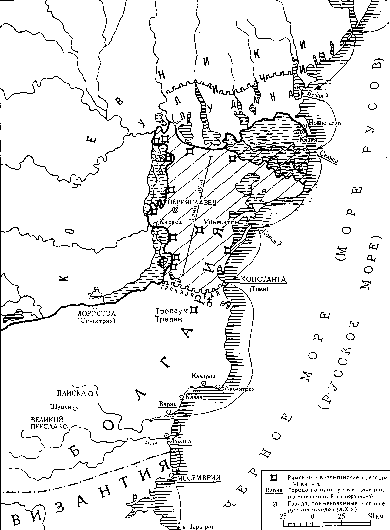 Всем этим условиям без исключения удовлетворяет то пространство между низовьями Дуная и Черным морем, где в 967 г. обосновался киевский князь Святослав, «взя город 80 по Дунаеви и седе княжа ту в Переяславци, емля дань на Грьцех».