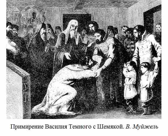 После этого Шемяка еще целых шесть лет не оставлял Василия Темного в покое. Забыв о клятвах (обычное для той эпохи дело), он продолжал именовать себя великим князем, то и дело затевал мятежи в разных областях страны, несколько раз пытался воевать, но ему все время не хватало сил.