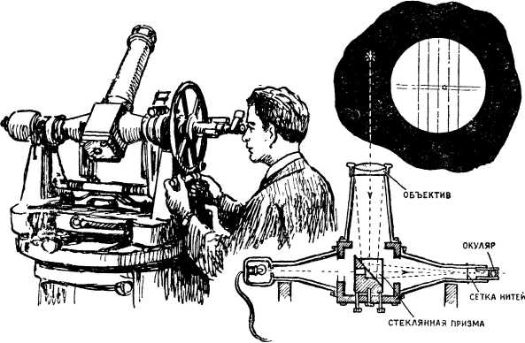 Ограничение подвижности пассажного инструмента не является его недостатком— наоборот, это его достоинство. Всегда лучше уметь делать одно дело, да как следует, чем много дел, но кое-как. Пассажный инструмент и приспособлен для выполнения одного дела: он позволяет очень точно замечать момент прохождения звезды через меридиан. И с этой обязанностью инструмент справляется прекрасно, гораздо лучше, чем иной большой телескоп. Неподвижная установка предохраняет астронома от многих ошибок при измерениях.