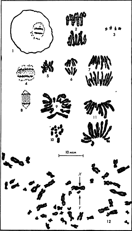 Внешний вид хромосом (1 — амебы; 2 — зеленой водоросли; 3 — гриба; 4 — липы; 5,6 — мухи; 7 — рыбы; 8 — бабочки; 9 — саранчи; 10 — жука; 11 — лягушки; 12 — человека)