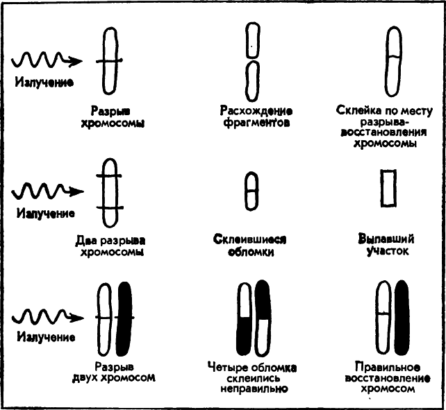 Поглощение энергии излучения клетками и тканями живого организма происходит практически мгновенно, в течение 10-6 — 10-5 сек. За это время облучение вызывает ионизацию, или возбуждение, молекул, увеличивая их химическую активность. Облучение приводит к разрывам нити ДНК, изменениям нуклеотидов, задержке деления и т. п. Даже доза в 200—300 рад приводит к разрушениям в хромосомах человека. Через 15—20 мин. после облучения под микроскопом видно слипание или разрыв их, распад на большие куски и отделение гранул. (Наблюдается и искажение веретена деления.) Оторвавшаяся часть не может соединиться с основным ее телом, или соединяется неправильно, или совсем с другой хромосомой и т. п. Все это ведет к тому, что дочерние хромосомы получают измененный неполноценный набор. Число хромосомных нарушений пропорционально дозе облучения. Так, в культуре тканей кур облучение мощностью в 100 Р привело к перестройкам ядра у трети клеток, в 1000 Р — у половины, а при дозе в 2500 Р — у всех клеток. В ДНК сразу после облучения небольшой дозой уменьшалась вязкость, нарушался синтез и т. п.