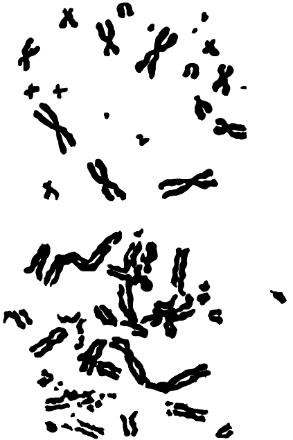 Хромосомы хомяка до облучения (вверху) и после (внизу)