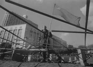 Мужчина с красным знаменем у Белого дома. Осенью 1993 года ельцинская власть подавила последний очаг сопротивления против бандитского капитализма – расстреляла Белый дом. Но именно это преступление отвратило от власти миллионы колеблющихся. Это станет понятно летом 1996 года, когда состоятся президентские выборы. Только подтасовками власти удалось сохранить на посту Ельцина.