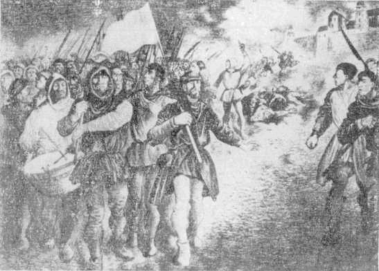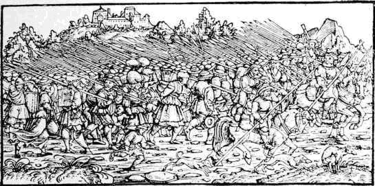 Крестьянский отряд в бою с ландскнехтами. Рисунок пером Альбрехта Дюрера, 1514/15 гг. (вверху)