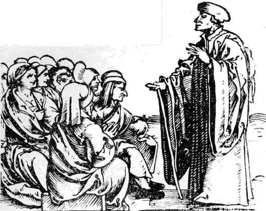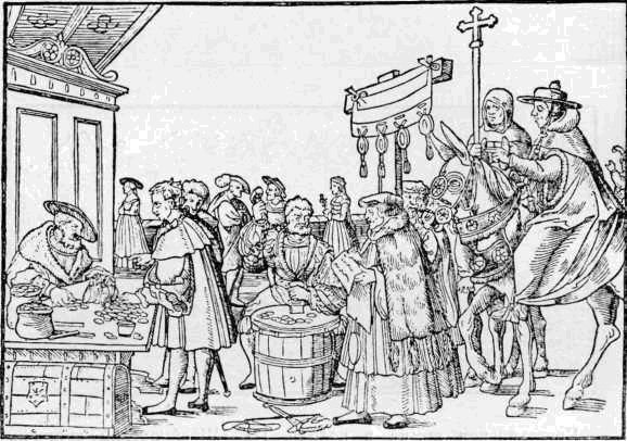 Листовка против торговли индульгенциями. Справа — группа проповедников отпущения грехов, в центре чеканщик монеты, слева — уплата денег за индульгенции. Гравюра на дереве Йорга Брейля Старшего