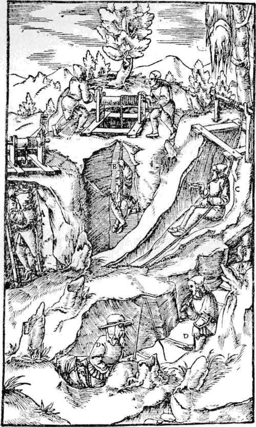 Горный промысел в XVI в. Из «Горной книги» Агриколы, 1556 г. Различные системы шахт и способов спуска в них горняков. Один из горняков спускается в шахту при помощи ворота (слева).
