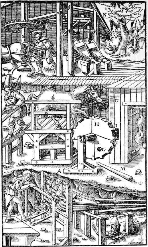 Рудоподъемный ворот, приводимый в движение при помощи длинного рычага воздуходувными мехами. Под ним — ступенчатое колесо, вращаемое лошадью. Внизу: ворот со ступенчатым колесом и воздуходувными мехами для вентиляции шахты