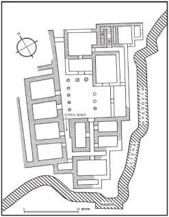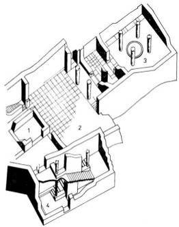 Дворец: На схеме: 1. Тронный зал или место для посетителей, 2. Вестибюль, 3. Мегарон, 4. Лестница