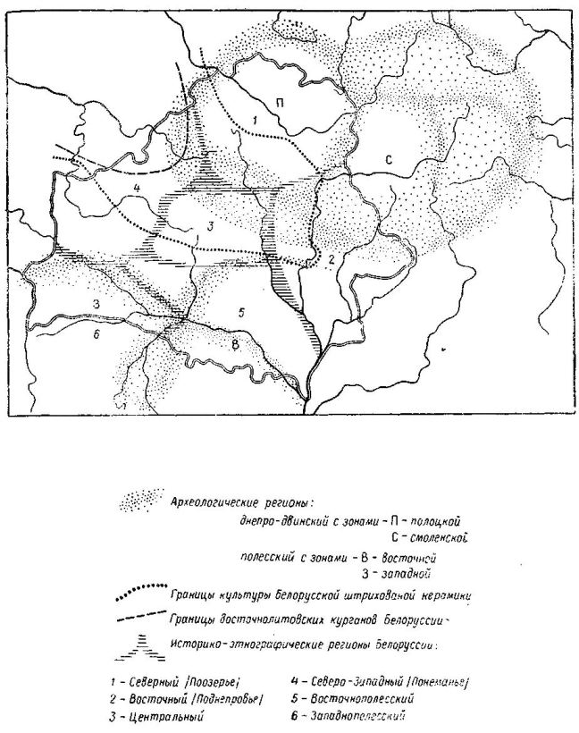 Этногеографические границы Белоруссии. При анализе карт ДАМБ и по данным литературы, о белорусских и псковских говорах можно отметить следующие пучки изоглосс, выделяющих соответствующие зоны: 1) Браслав - Глубокое (верховья Березины и далее по южной части Витебской области) - Ушачи - Витебск, реже до Орши; 2) Гродно - бассейн Дриссы - бассейн Западной Двины - Витебск; 3) Полоцк- к востоку от Витебска, Орши, реже до Могилева; 4) Себеж - Невель - Усвяты; 5) Себеж - Идрица - Пустошка - Новосокольники - Великие Луки; 6) Красногородское - Опочка - Пушкинские Горы - Новоржев - Великие Луки. По данным этнографии, также выделяется общий Северный регион: основная территория Витебской области, за исключением Толочинского, Оршанского и Дубровенского районов, и северная часть Минской области. Южная граница проходит по Днепро-Двинскому водоразделу, севернее Борисова и Логойска на Поста вы. Таким образом, на протяжении тысячелетий и здесь мы видим совпадение в одних и тех же зонах археологических, лингвистических и этнографических границ. Центральная Белоруссия - это третий крупный регион. Сюда входит территория, расположенная между юго-западной пограничной полосой Днепро-Двинского региона (приблизительно в направлении Краслава - Браслав - верховья Вилии и Березины-Могилевское Поднепровье) и северной границей Полесья, а в широтном - от Днепра до западных границ Белоруссии. Здесь нет той последовательной сопряженности границ археологических культур, фиксируемой севернее и южнее. В раннем железном веке здесь существует достаточно самостоятельная культура штрихованой керамики (VIII-VII вв. до н. э.- первые века н. э.). Образуя широкие контактные полосы с синхронными культурами днепро-двинской и милоградской, она охватывала территорию: 1) на востоке доходящую до Днепра (Орша - Рогачев), а на юго-востоке, возможно, и до Сожа; 2) северная граница проходила по линии: оршанское Поднепровье - бассейн Уллы - среднее течение Десны - западнодвинское пограничье Белоруссии и Латвии; 3) южная граница - Рогачев - низовья Свислочи - верховья Случи - бассейн Немана; 4) на западе культура выходит в Латвию, Литву и Эстонию, где, по-видимому, представлена своеобразными вариантами. Таким образом, область белорусской штрихованой керамики по отношению к территории с памятниками сходного облика образует нечто вроде клина между бассейнами Западной Двины и Припяти, основание которого находится в Прибалтике [74, с. 59-69]. В середине I тыс. н. э. здесь появляются памятники типа Банцеровского городища, представляющие юго-западную часть массива культур верхнеднепровского и западно-двинского бассейна (Банцеровщина - Тушемля - Колочин). В поречье Вилии и Немана также около середины I тыс. фиксируются так называемые восточнолитовские курганы, основная территория которых расположена западнее белорусско-литовского пограничья. В целом лингвисты всегда выделяли следующие белорусские диалектные зоны: 1) северо-восточную и 2) юго-западную. Южная граница северо-восточной зоны проходит по линии р. Свирь - Минск - Могилев - Сурож, а северная граница юго-западного диалекта - в районе Лида - Минск - Бобруйск - Речица - Лоев (Гомель). На северо-востоке выделяют группы могилевско-витебскую и очень близкую к ней полоцкую. Наиболее яркие пучки изоглосс здесь проходят в широкой переходной зоне по линиям: Ошмяны - Минск - 