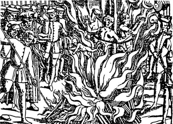 Сожжение лютеран в Испании. Английская гравюра 15 в.