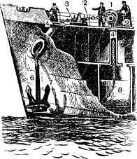 Якорное устройство. 1 — брашпиль; 2 — якорная цепь; 3 — стопор; 4 — цепные трубы; 5 — бортовой клюз; 6 — веретено якоря; 7 — лапы якоря.